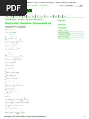 Lagu Kartonyono Medot Janji dinyanyikan oleh penyanyi asal Ngawi Jawa Timur yaitu Denny Caknan. Capo di fret 5 Intro F C G Am G F C G C Berdiri ku di sini Em hanya untukmu Am F G Dan yakinkanku untuk memilihmu C Dalam hati kecilku Em inginkan kamu Am F G Berharap untuk dapat bersamamu F C F C Aku kan ada untuk dirimu F C G Dan bertahan untukmu Chorus C G Terlukis indah raut wajahmu. Ade Dosa Siapa Ini Dosa Siapa.