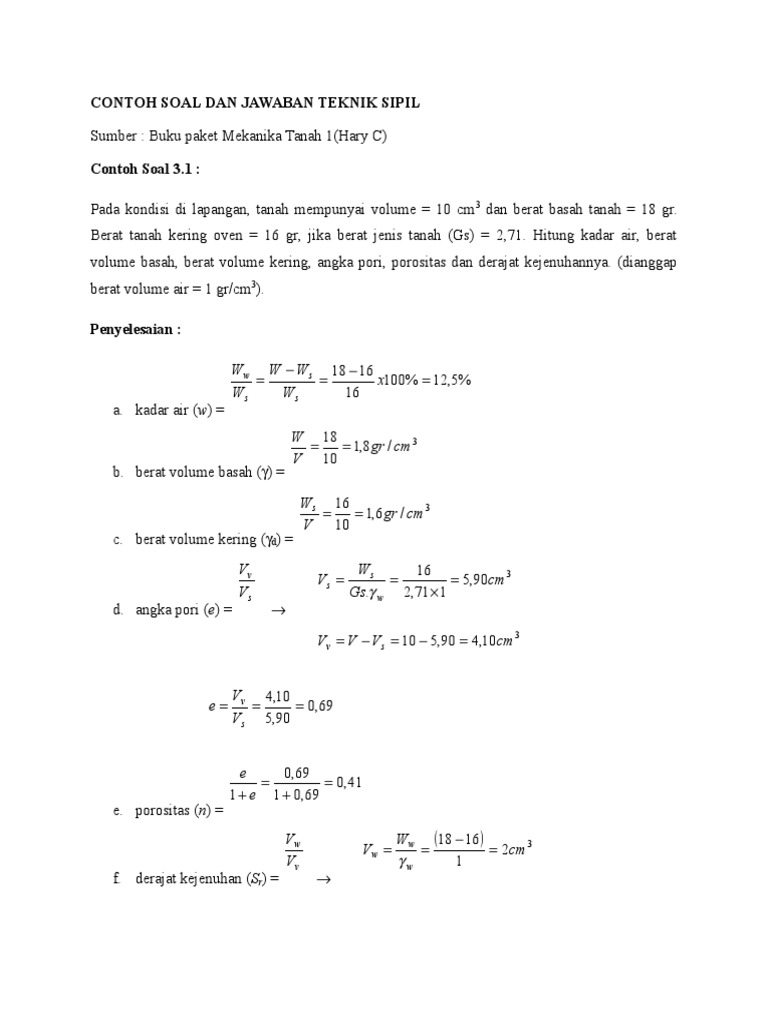 07012020 CONTOH SOAL DAN JAWABAN TEKNIK SIPIL academia edu contoh soal tes tkb teknik sipil CONTOH SOAL DAN JAWABAN TEKNIK SIPIL Sumber Buku paket Mekanika Tanah 1 Hary C Contoh Soal 3 1 Pada kondisi di lapangan tanah mempunyai volume 10 cm 3 dan berat basah tanah 18 gr Berat tanah kering oven 16 gr jika berat jenis tanah Gs 2 71. Pada kondisi di lapangan tanah mempunyai volume 10 cm3 dan berat basah tanah 18 gr. CONTOH SOAL DAN JAWABAN TEKNIK SIPIL academia edu contoh soal tes tkb teknik sipil CONTOH SOAL DAN JAWABAN TEKNIK SIPIL Sumber Buku paket Mekanika Tanah 1 Hary C Contoh Soal 3 1 Pada kondisi di lapangan tanah mempunyai volume 10 cm 3 dan berat basah tanah 18 gr Berat tanah kering oven 16 gr jika berat jenis tanah Gs 2 71.