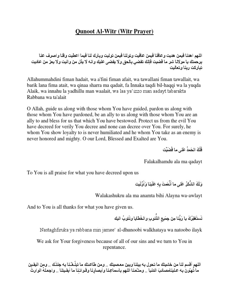 Also transliterated Qunoot literally means being obedient or the act of standing in Classical Arabic. Allahumma ahdina fiman hadait wa afina fiman afait wa tawallana fiman tawallait wa barik lana fima atait wa qina wasrif anna sharra ma qadait fainnak taqdi wa la yuqda alaik. Fainnaka taqdhi wala yuqdha alait.