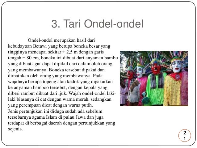 Play this game to review Other. Gerakan dasar tari tugas seni budaya 03 Oktober 2018. Ondel-ondel adalah boneka besar yang dibuat dari anyaman bambu dengan ukuran tinggi 25 meter dan diameter 08 meter.